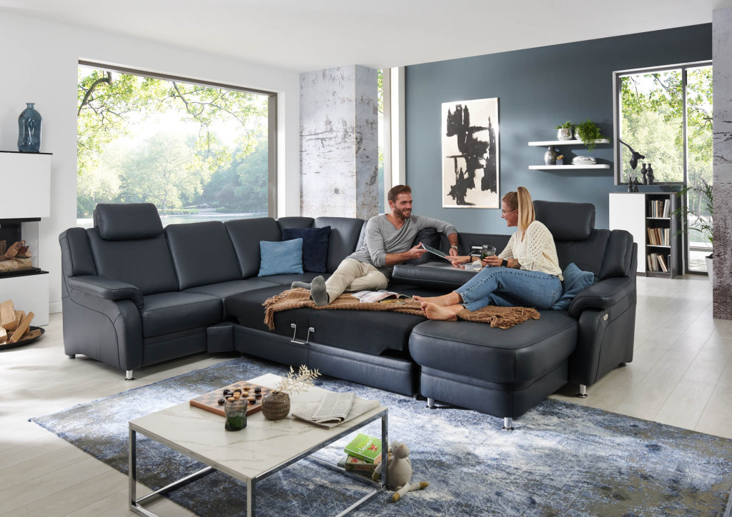 Lust auf Wellnessurlaub? Dann holen Sie sich Ihre private Wohlfühl-Insel doch einfach nach Hause. Maßgeschneidert und nach Ihren Ansprüchen. Die aktuellen Polsterlandschaften bieten alles, was das Herz begehrt. Die Wohnlandschaft überzeugt nicht nur mit optischen Qualitäten sondern begeistert auch mit enormer Planungsvielfalt. Ob an der Wand entlang, elegant um die Ecke, mit Canape oder als Zwei- bzw. Dreisitzer - das flexible Sitztalent passt sich jedem Raummaß elegant an. Zwei verschiedene Sitzqualitäten sorgen zudem für höchsten Komfort. Freuen Sie sich auf viele Stunden Entspannung. Und nehmen Sie gern das Smartphone oder Tablet mit auf die Polster-Insel. Denn in der praktischen Funktionsablage sorgen eine integrierte Steckdose und ein USB-Anschluss für Strom ohne Ende. Außerdem auf Wunsch inklusive: Bettfunktionen, Anstellhocker, Funktionsablagen, Kopfstützen und geräumige Schubkästen.
